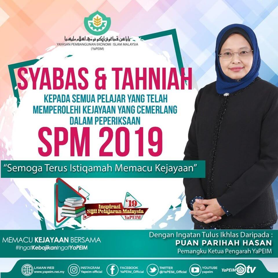 SYABAS & TAHNIAH kepada semua Pelajar yang memperoleh Kejayaan Cemerlang dalam Peperiksaan SPM 2019 ‘SEMOGA TERUS ISTIQAMAH MEMACU KEJAYAAN’ Ikhlas daripada Pemangku Ketua Pengarah, Pengurusan Utama & Seluruh Warga YaPEIM. #yapeim #memacukejayaanbersama #mac2020 #ingatkebajikaningatyapeim