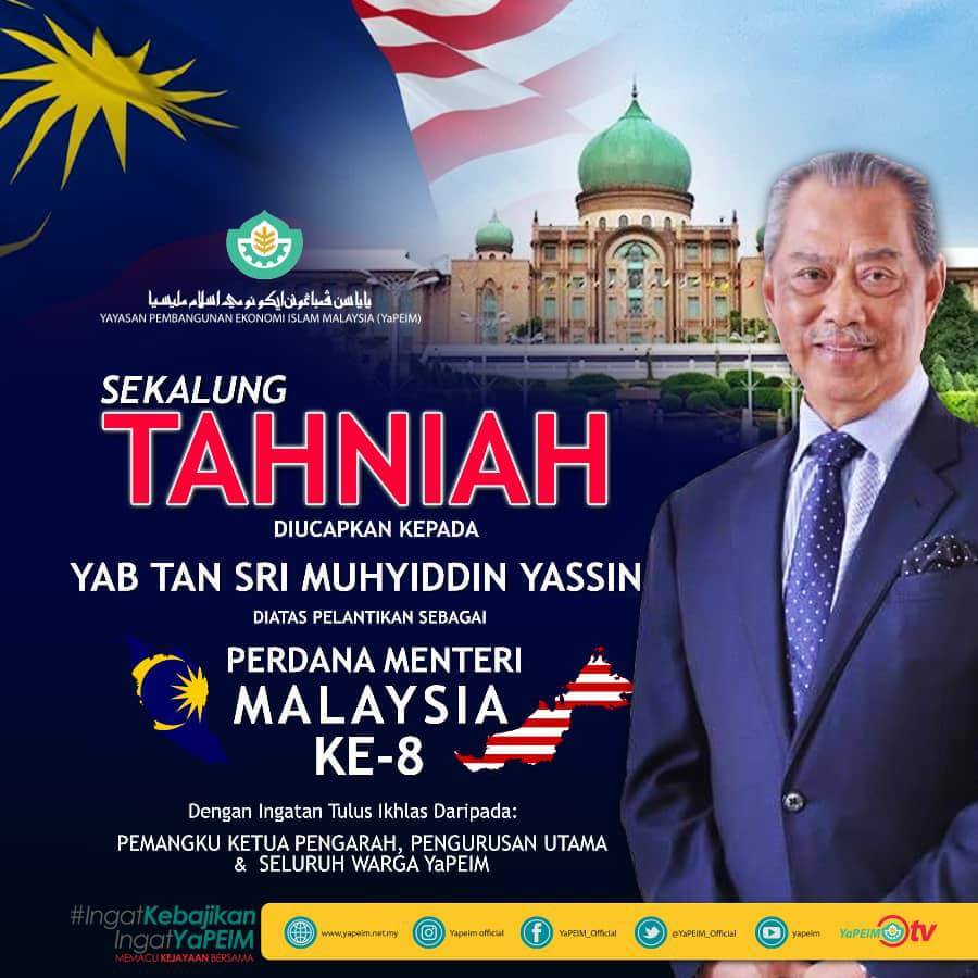 Pemangku Ketua Pengarah YaPEIM; Pengurusan Utama serta seluruh Warga YaPEIM mengucapkan TAHNIAH kepada YAB TAN SRI MUHYIDDIN YASSIN diatas Pelantikan sebagai PERDANA MENTERI MALAYSIA ke-8 #yapeim #memacukejayaanbersama #mac2020 #ingatkebajikaningatyapeim #pm8
