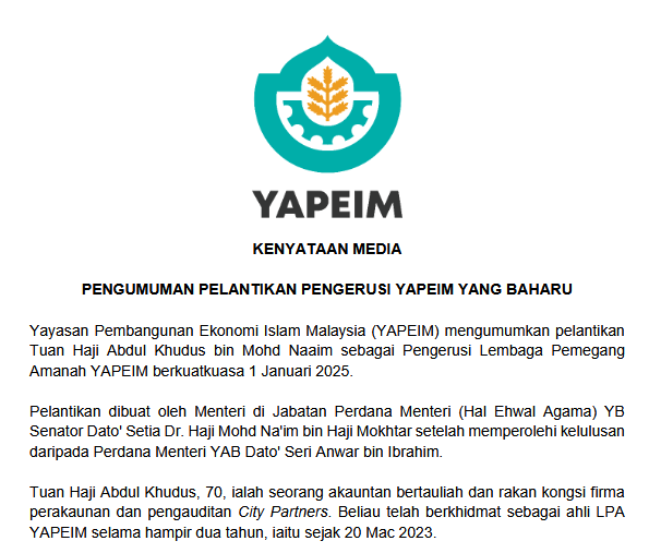 Kenyataan Media Pengumuman Pengerusi YAPEIM Yang Baharu