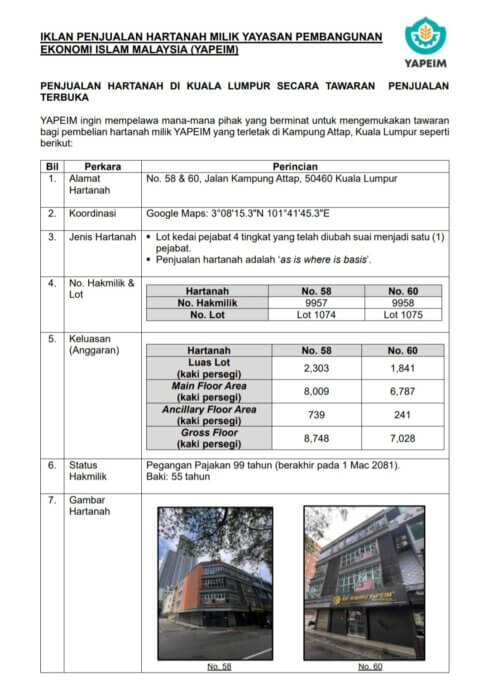 Pengiklanan Penjualan Hartanah YAPEIM (No. 58 & 60, Kampung Attap, Kuala Lumpur)